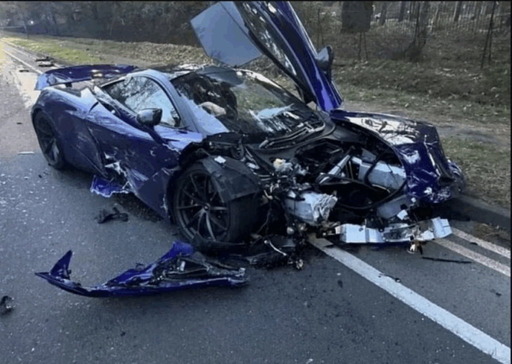 Photographs which since emerged online show a destroyed McLaren supercar on a rural road.