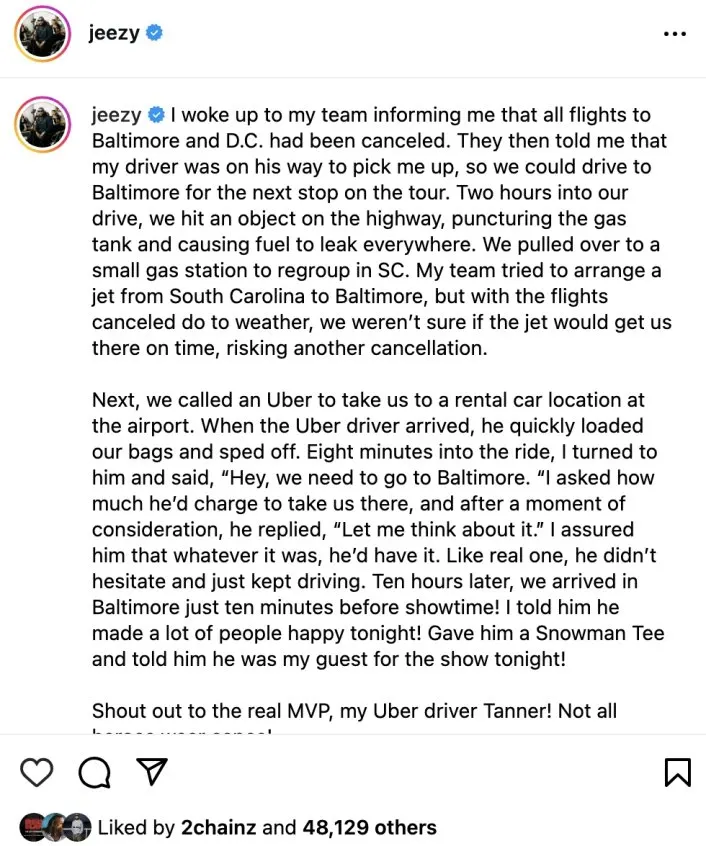 Posting on Instagram, Jeezy wrote: “I woke up to my team informing me that all flights to Baltimore and D.C. had been canceled. They then told me that my driver was on his way to pick me up, so we could drive to Baltimore for the next stop on the tour.